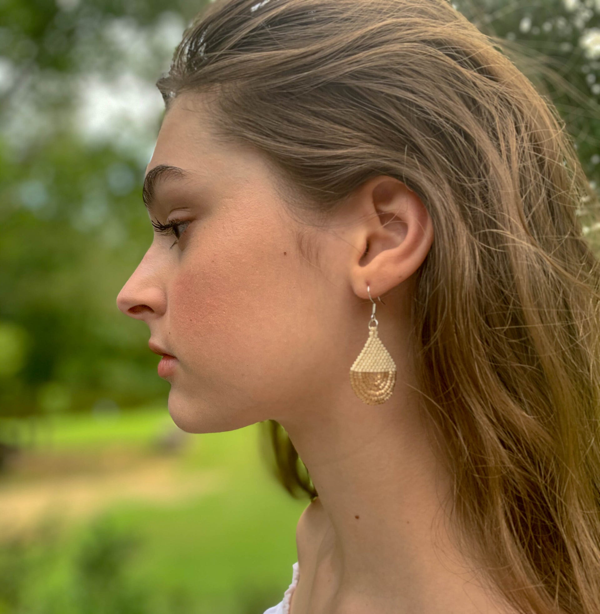A captivating cream and taupe drop earring, handcrafted with Miyuki beads, that will easily elevate any outfit. It is one of our most sought-after pieces, adding a touch of sophistication to any ensemble.