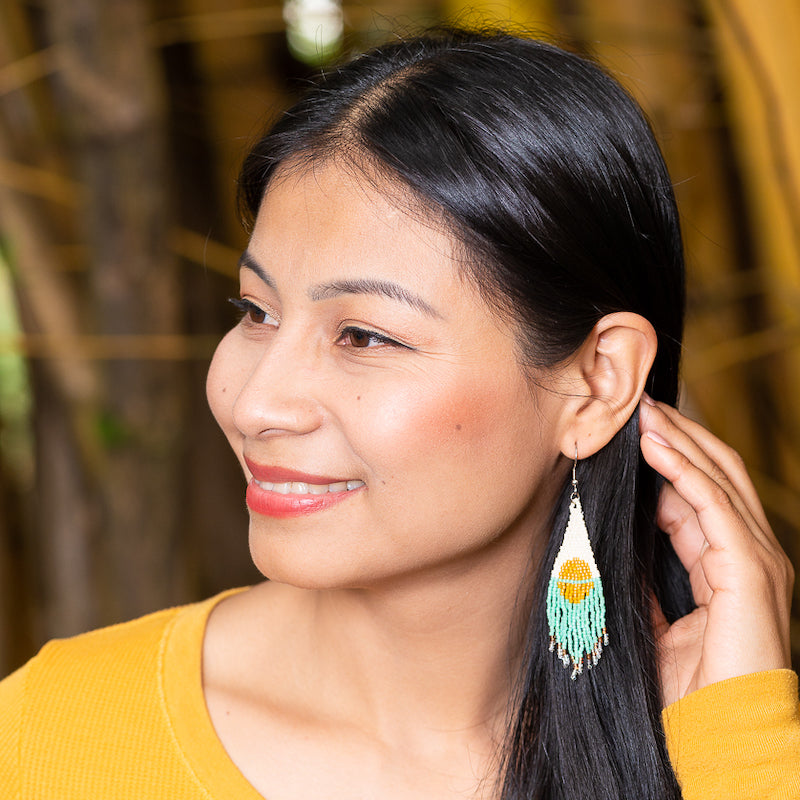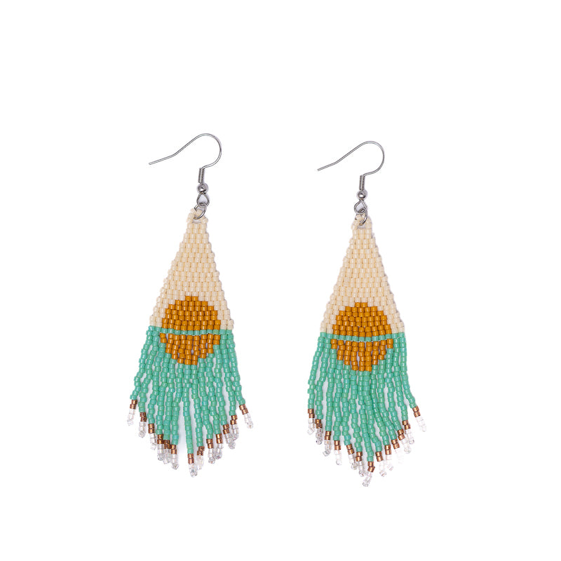 Show off your unique style with these Erica Earrings! Handmade with blue, cream, and mustard miyuki beads, these fringe style earrings add a splash of color and a touch of playful fun to any outfit! So go ahead and make a statement – you'll be sure to turn heads!