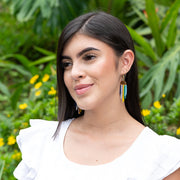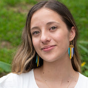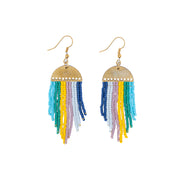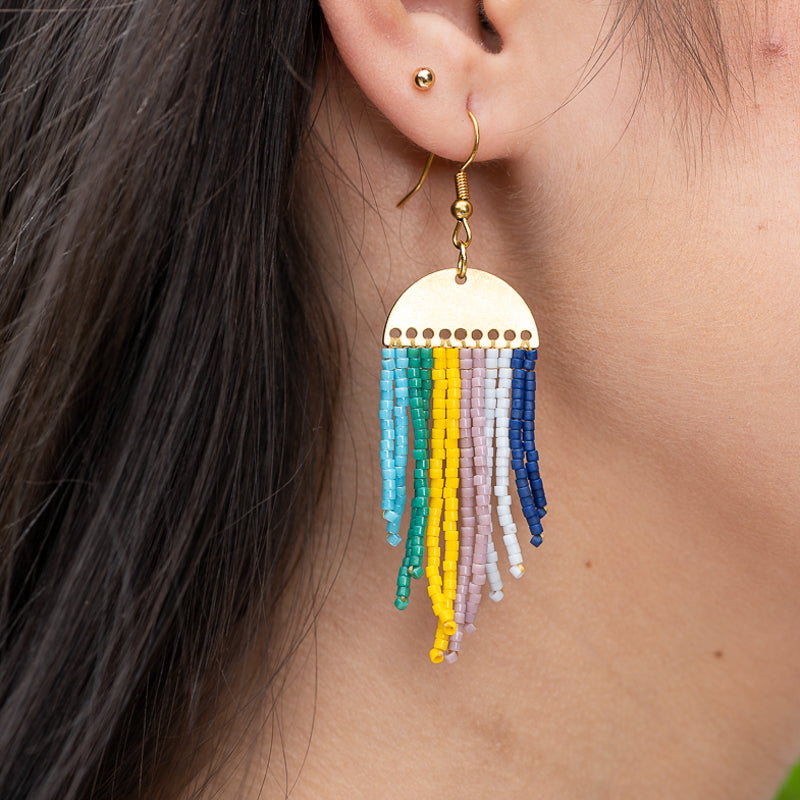 Get ready to dazzle with the Sao Paolo Earrings! These fab earrings are like a carnival for your ears, featuring a gold-colored half-moon adorned with vibrant, handwoven Miyuki bead fringe. With a playful mix of blue, yellow, purple, and green beads, these earrings are bursting with color and fun. Perfect for adding a splash of festive flair to any outfit, the Sao Paolo Earrings will have you dancing through your day with a smile. Embrace the party vibes and let your style shine with these show-stopping earrings!
